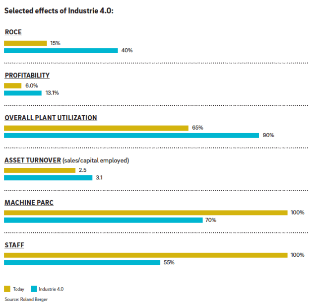 Fruto de la aplicación de estas tecnologías habilitadoras el informe calcula una serie de efectos de la industria 4.0 para las compañías que implementen este concepto, entre los que destaca un incremento de 25 puntos en el ROCE (Vid. Figura 1)