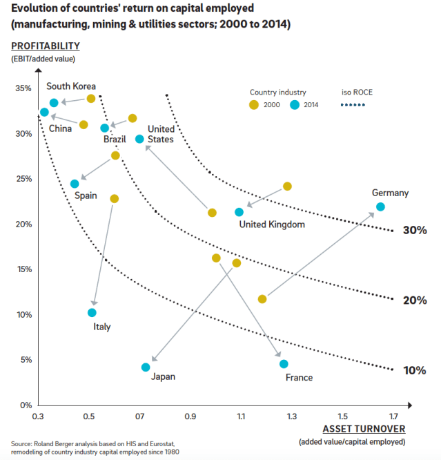 De hecho, el informe muestra cómo los países pioneros en seguir la ruta hacia la industria 4.0 (como es el caso de Alemania) son los que han mejorado significativamente su ROCE a lo largo de los últimos 15 años (Vid. Figura 2).